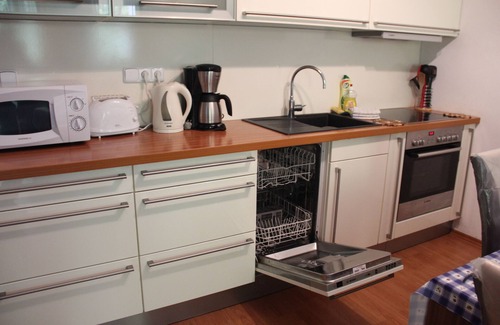 Fully fitted kitchen, dining room table, large refrigerator, electric cooker/oven, microwave, kettle, toaster, dishes, dishwasher, cleaning supplies. Sofa beds, double bed, Sat TV (wide range of programs in Russian, English). Exit to balcony.