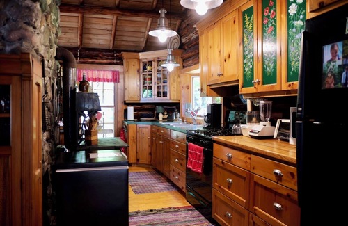 The original part of the home has sleeping quarters with two twin beds, adjacent to a full bath with a stand-up shower, which leads into a stunning living area with high vaulted ceilings, a second large stone wood burning fireplace to relax around, and a large dining area. There is also Roku available for streaming your favorite shows.