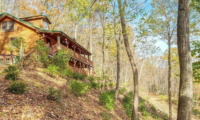 This home comes complete with fire pit, hot tub, game room, 65" Roku TV, wrap around deck, fully equipped kitchen, and a walking path through the woods. There is something for everyone in this beautiful and spacious log home.