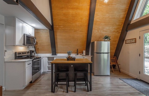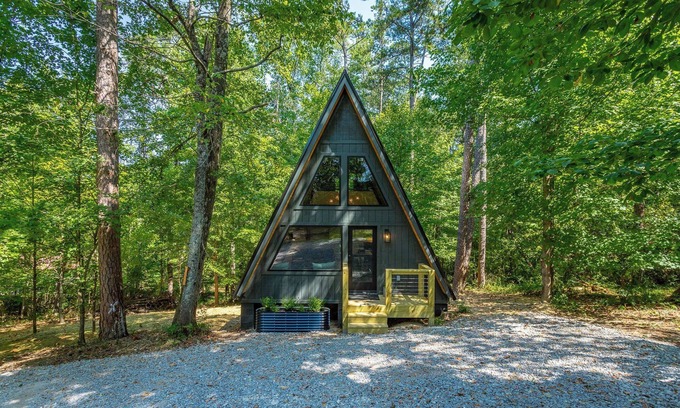 Take it easy at this unique and tranquil getaway. Conveniently located close to downtown Chattanooga, but far enough away to enjoy the woodsy relaxing treehouse feel in this super unique A-Frame cabin! Only 5 miles from downtown Chattanooga and 5 minutes from the Chickamauga Battlefield! The Linden A Frame is a NEW beautiful and unique 1 bedroom 1 bath cabin. It has a full kitchen, full size fridge, range, microwave and all of the cooking essentials needed for your stay! It offers the perfect outdoor space on the back deck overlooking the woods! Perfect for relaxing under the string lights. The living room is open and spacious, and has a remote operated projection screen perfect for movie night! The stairwell ladder will take you up to the sleeping loft with a queen sized bed and a large window, looking out into the trees.