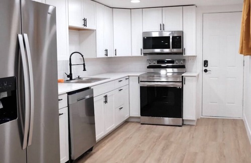 This basement is very spacious, with all the amenities you need! There are 2 bedrooms with queen size beds. Brand new mattresses, furniture, and appliances! Full bathroom with 2 sinks. This house was built in 1957, we gutted the entire home though it was in such mint condition! Before the remodel it was very retro, with wood paneling walls throughout the basement, yellow floors, and blue carpet upstairs with popcorn ceilings! They even had a funky carpet wall! It was a sight to see.