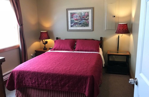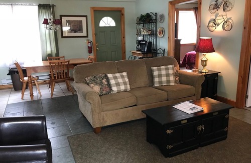 The door to Lindsey's Cottage opens to the living room, with a door to the full bathroom to the left. Straight ahead is the dining area and kitchen. Both bedrooms feature queen beds and large closets, and are to the right of the living and dining areas. The living room sofa pulls out to a sleeper, which can accommodate two guests if needed.