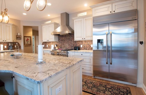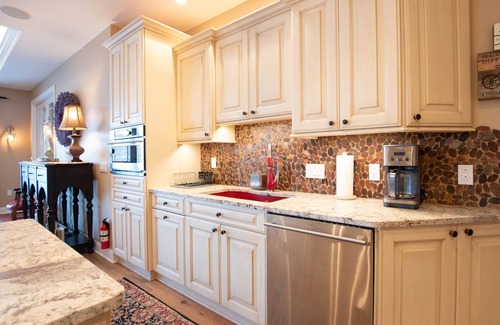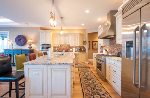 The dining area features a large wooden dining table with cushion leather chairs for eight, and a bar counter for seating five; plenty of room to host your family dinners! The kitchen is a chefs dream with all the modern amenities you could ask for including a gas range, wine refrigerator, stainless steel appliances and expansive island. This kitchen will be a favorite gathering spot during your Finger Lakes getaway for sure.