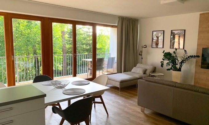 Offering a garden, Lipno Port Apartment C101 features accommodations in Lipno nad Vltavou. This apartment provides free private parking, a concierge service, and free Wifi. The accommodation offers private check-in and check-out and organizing tours for guests. Providing a terrace and garden views, the spacious apartment includes 2 bedrooms, a living room, satellite flat-screen TV, an equipped kitchen, and 2 bathrooms with a shower. Towels and bed linen are provided in the apartment. For added privacy, the accommodation features a private entrance. A water park is available on-site, and both skiing and cycling can be enjoyed close to the apartment. Castle Český Krumlov is 20 miles from Lipno Port Apartment C101, while Lipno Dam is a 13-minute walk away. Ceske Budejovice Airport is 35 miles from the property.
