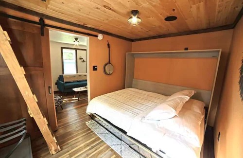 There is a bedroom with a comfy queen sized murphy bed, and a little work station for a computer. There are no closets in the home, but plenty of spaces to unpack your things! The home is a charming space that was carefully designed to be cozy yet practical, and has just about everything you will need for your stay.