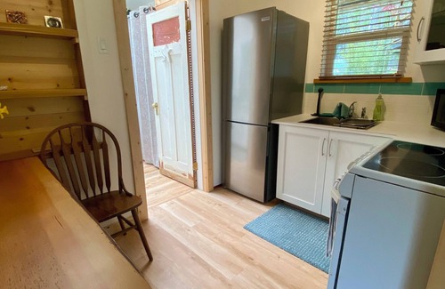 The studio cabin designed for privacy and comfort enjoy the patio deck with parking out front. Comfy queen-size bed with 100% Egyptian cotton sheets and down-filled quilt. Small but fully equipped kitchen with oven/stove, microwave and a good size fridge plus a BBQ outside. Spacious, bright bathroom with large skylight that makes it feel like you’re in an outdoors shower. Washer and dryer for longer stays. Hiking and mountain bike trails within walking distance. Oceans and lakes only a short drive away.