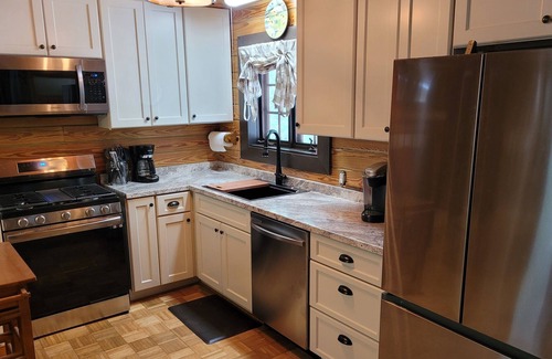 The kitchen comes equipped with a brand new Samsung full-size refrigerator, dishwasher, gas stovetop and oven. You will find a countertop microwave and both a drip coffeepot and Keurig for your use, and a full complement of utensils, flatware, and cooking/baking supplies. You are welcome to use anything that is in the fridge or pantry during your stay. Cleaning supplies – including dish detergent and dishwasher pods – are provided under the kitchen sink. You will find spare paper towels in the laundry room.