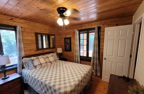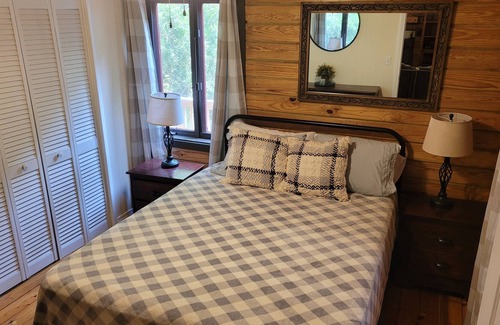 This is a sweet wood cabin, with one bedroom and one bathroom, and a comfortable living space. The bedroom features a queen bed with a memory foam mattress, and a closet and dresser for clothing storage. The fully remodeled bathroom has a sink, stand-up shower, and toilet. There is a full-size stackable washer and dryer in the bathroom as well.