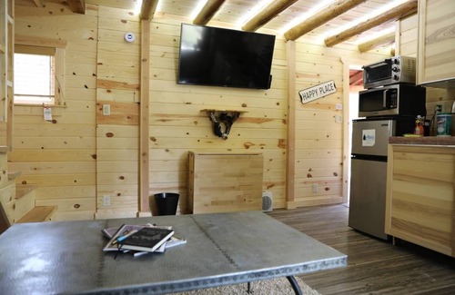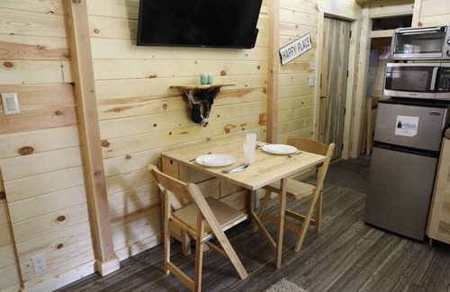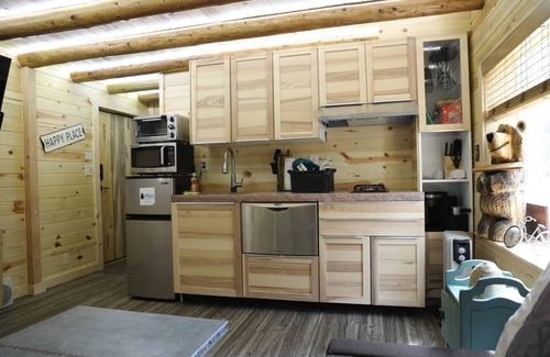 This delightful cabin, affectionately known as "The Little Chalet," is perfect for small groups of 1-3 adults, providing an atmosphere of coziness and comfort. The custom-made queen aspen log bed in the loft accommodates two, while the mini fridge boasts a tiny freezer. The studio kitchen includes a toaster oven and microwave, along with a charming dining area for 4-5 guests.