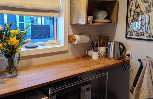 *Kitchenette with hot plate, small fridge, microwave, kettle, toaster etc. Note: there is no sink in the kitchen due to local council rules, but there is a large one across the hallway as noted below.