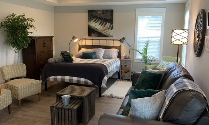 Newly built studio unit with Industrial themed decor. 480 sq. Feet furnished with a Queen bed, living room with leather pull out couch, dining area, kitchenette with private bathroom. Private, separate entrance, large backyard, and hot tub. Located near parks, river, bus stops, restaurants, cafes and grocery stores. Driving distance of 5-7 mins. to downtown, the airport and TRU. forty-five minutes to Sun Peaks.