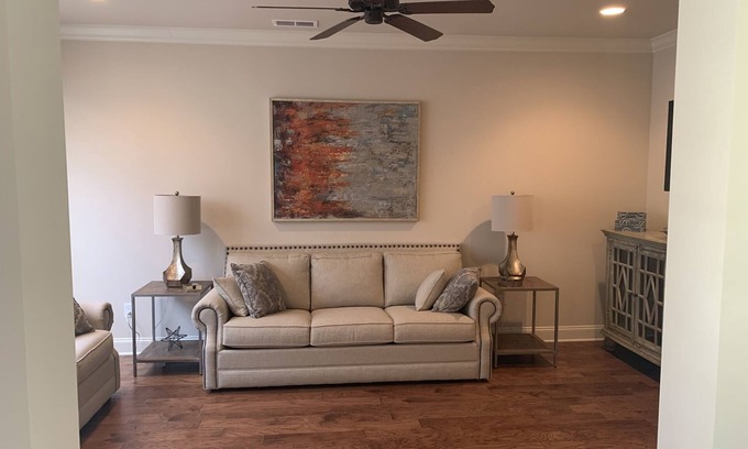 Located next door to the University Golf Course, 2 miles from the Ole Miss campus, and 2.7 miles from the historic Oxford Square! A perfect location to all things and events in Oxford including the Grove, football games and all sporting events at Ole Miss, FNC Park for youth baseball and soccer tournaments, etc... Tastefully decorated and perfect for all groups!