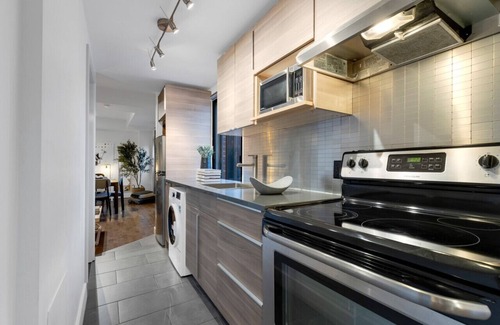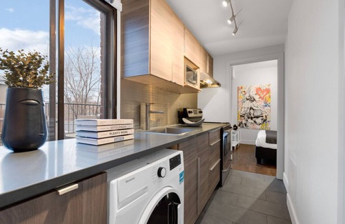 Experience Montreal like a local. Stay in this Deluxe 1-Bedroom Suite in the Plateau, just minutes from Downtown. Perfect for couples, families, or business travelers, this stylish retreat features a cozy lounge, curated artwork, Smart TV, Super-Fast WiFi, modern comforts, a full kitchen, and access to a shared rooftop patio with BBQ and lounge seating. Steps from restaurants, cafés, nightlife, shopping, and metro access.