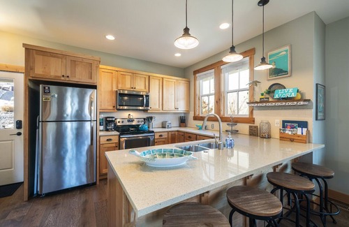 The kitchen has an easy flow with a large bar and stainless appliances. Stocked with small appliances, a toaster, a blender, a hand mixer, and a coffee pot. Pots and pans, baking dishes, serving dishes, and platters. All the utensils you will need to prepare a meal and a grill on the back patio. Also, kids' dishes and plastic patio/deck ware are located in the kitchen.