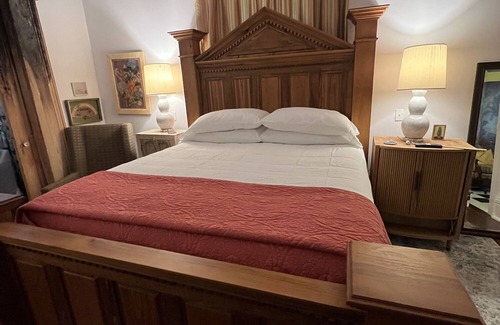 The first room (aka 1st bedroom) features a queen-size sofa sleeper (with freshly ironed linens) which provides extra sleeping space (when needed). The original 195 year old long leaf pine floors have been refinished to add to the beauty of the place. There are 2 reading/conversation areas, and a plush rug. AC/Heating unit will keep the room cozy all year round.