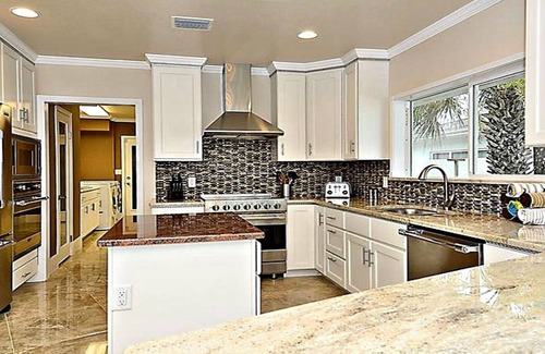 Oceanfront Open kitchen, dining and living room, LCD TV, surround sound system, laundry room, wine cooler.