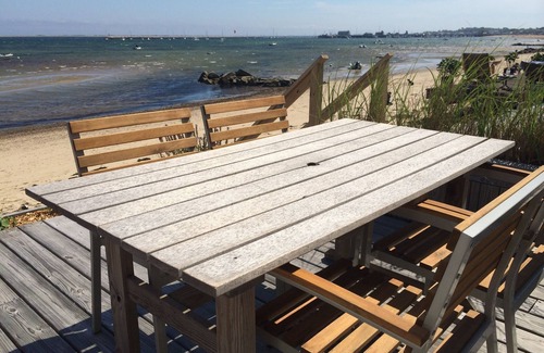 This luxury two-bedroom 2.5 bath, 1200 sq ft. house is literally a few feet from the lapping water of Provincetown harbor. Its stunning location is one of the most unique properties in town with amazing water views from every room. Early birds can watch the sun rise while enjoying coffee in bed. Step right onto the beach from your private deck or sit in the deck chairs and enjoy a glass of wine. Located in the East End, you are only a five-minute walk to the Art Gallery District.