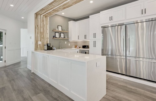 Additionally, the lower level features a modern family room with a wood-burning fireplace, keeping you warm on cool nights. The family room is set off with a striking u-shaped couch, maximizing conversation amongst your vacation-goers. Plus, there’s an oversized bedroom and en suite bathroom on the lower level, featuring two king-sized beds, a six-drawer dresser and comfortable chair for lounging or reading a book. The bathroom has two sinks, an LED mirror with built-in lighting, and an oversized shower that can easily accommodate two.