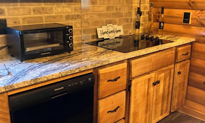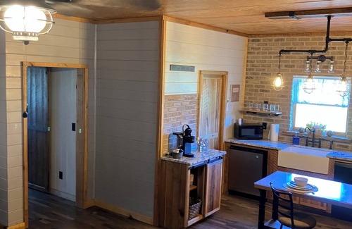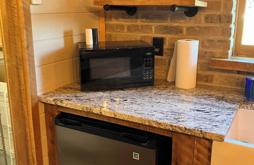 Most of the living space is handcrafted including sawmill lumber cabinetry, black iron pipe light fixtures, a farmhouse sink, and log/shiplap walls. It features a full kitchen, granite tops, a French rain shower, gas fireplace, and a large porch to view the llamas and mountains.
