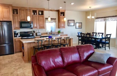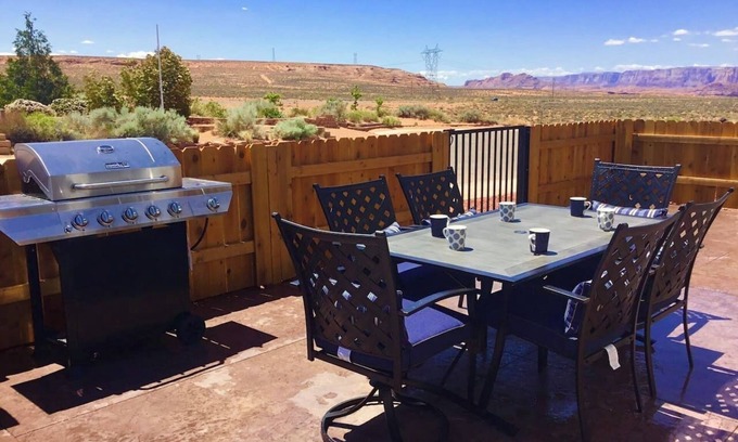 NEWLY built 3BD 2BA, (king, king, plus bunk room with a twin over twin and queen over queen) sleeps up to 10-12 in a tranquil neighborhood on the edge of Page; view of the Vermillion Cliffs from the FRONT courtyard-patio table and BBQ plus elevated front porch, minutes from downtown.