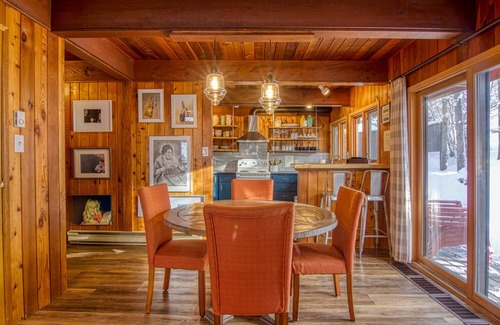 An authentic ski chalet with that rustic cabin feeling, Hygge Lodge can comfortably accommodate up to 10 people. The open floor design features a welcoming and bright living room that leads to a separate dining area and kitchen. A unique cabin layout allows large groups to gather together in common areas to be social yet also provides separate living spaces where families can have privacy of their own.