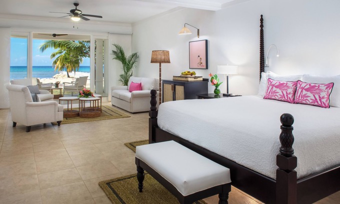 Oceanfront junior suites come with generous space both inside and out. These airy beachfront suites are spacious and well-appointed, featuring living areas and expansive bathrooms. Step out onto the breezy patio or balcony and feel at ease by the breathtaking Caribbean Sea views afforded to these suites. Rooms feature King-sized or double beds (subject to availability). Located at Founders Cove.