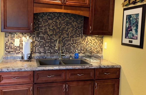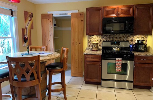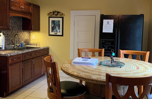 The full size kitchen with dinette is equipped with all appliances, kitchen utensils, pots and pans, and dishes to prepare your own home cooked meals. The dinette provides the perfect environment to enjoy a glass of wine in the dimly lit lighting and hand crafted table created with a wine barrel and wine corks!