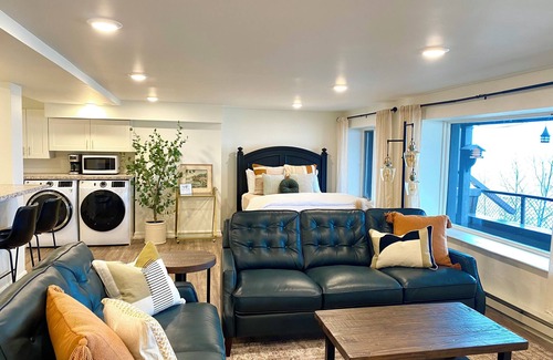 As you enter this studio style apartment, guests will descend a flight of stairs which will lead to the lower level of the building overlooking Lake Superior. This space includes the living room, dining area, kitchen, bathroom and sleeping quarters all on one level.