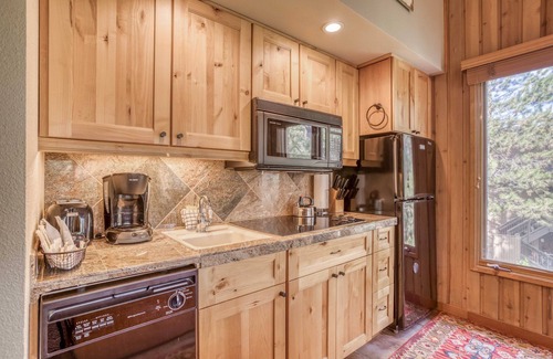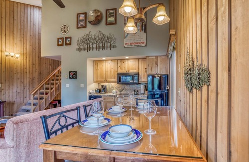 Enjoy the best of both Central Oregon worlds from this two-bedroom, 900 sq. ft. upstairs condo, with quick proximity to Bend's exciting downtown and easy access to the outdoors for skiing, water sports, golf and hiking. With all the amenities at Mt. Bachelor Village Resort, you'll also find it's fine to relax in peace, with a swim in the pool or a hike along the Deschutes minutes from your door. This inviting condo features a living room brightened by vaulted ceilings and a wall of windows and sliding door to an elevated balcony in the woodsy setting of the resort. A gas fireplace, large TV, chairs and a sofa that doubles as a sleeper give you space to relax with family and friends. Prepare dinner in the kitchen and eat indoors in the dining area, or eat al fresco from the grill outdoors on the deck. The main-level bedroom is separated from the living area by a full bath. A light-filled upstairs loft has sleeping quarters, too, and a separate bath, so there's plenty of room to invite friends to join you in your exploration of all the wonderful sights and activities in and around the area. Book a stay at Ski House and discover why this well-equipped home is such a desirable and affordable choice—you'll find the sky's the limit for amenities, ease, and access to all the things you enjoy about Bend!