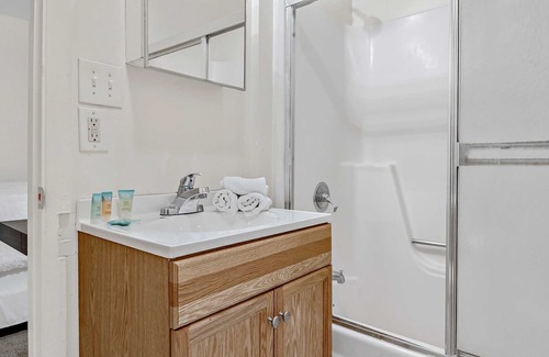 The bedroom boasts a queen-sized bed and is equipped with bedside stands with lamps. The bathrooms feature bathtubs and vanities with cabinets, as well as towels and toiletries for your use.