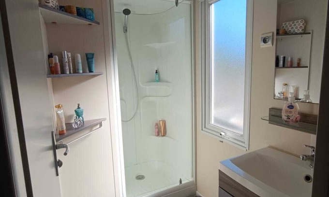 Guest accommodations at Location dun Mobil Home Avec Climatisation Réversible, 4 Personnes offer air conditioning. Bathrooms include showers and hair dryers.