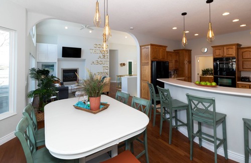 Downstairs there are four bedrooms and two full bathrooms. Three of the bedrooms offer queen sized beds. The forth bedroom is perfect for the kids with two full beds and two twin beds. Another large living room for entertaining with a pool table.