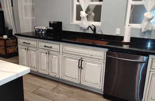 This property is in the heart of downtown Phoenix. The house has private parking for three vehicles. The main bedroom has a bathroom and shower that feels like a spa. This split floor plan is great for entertainment. The gourmet kitchen is amazing to prepare giant feasts. There is a fireplace in the front room and a fire pit outside if you wish to people watch. This place is great for big parties!