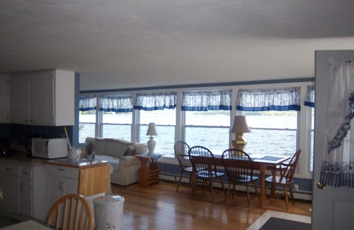 You will have panoramic views of Lake Winnisquam and Gunstock mountain from the kitchen living room and dining room bring your boat or rent one at Winnisquam's Marina or Jay's Marina. This great spot on Western side of lake on an acre of land set off a dirt country road so relaxing great hide away and only1 hour and 15mins from Boston.15 mins to gunstock mountain close to all ski resorts exit 20 off of 93n Don't forget the famous Tilton tax free outlet shopping mall only mins away and if you like to golf enjoy Lochmere's golf and country club. We offer trash pick up along with a fantastic cleaning staff. You will need linens for a queen two twins and one queen size futon. If we do supply your linens, please return clean in the bins. We do supply BBQ grills but you may want to bring an extra gas tank as we do not provide the propane.The grounds are well manicured. We offer many updates over the years . Please check out our reviews. We start booking up for Spring in Summertime fun by the New Year. Call now to let us know how we can help make your vacation plans happen. If you like waterfront you can not get any closer other than to splash! We are 100ft of water frontage. You feel like you are on a cruise ship with the panoramic views and watching the loons and fish swim by the crystal clear lake and sandy bottom. We have a pool ladder to help you enter the lake for swimming. Enjoy our quiet lot and magnificent water views. There are all types of grocery stores on the way to the waterfront home. The home is also completely furnished two tv's great dining dishes and stemware decorated with such fun water themes. Hope you come and enjoy our special spot for your next vacation. This is a great escape on the lake with million dollar views... A hidden jewel!