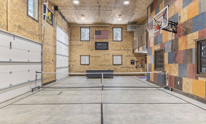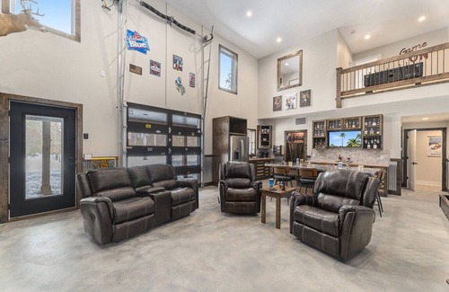 The interior is designed with fun and relaxation in mind. Kids will love the indoor playhouse with a slide, while the whole group can enjoy the foosball table, shuffleboard, arcade and an incredible indoor pickleball/basketball court—perfect for a little friendly competition. A fully equipped laundry area ensures convenience throughout your stay. Check out the additional living area (Man Cave) with garage door opening to the great outdoors. Room includes arcade, bar area and large tv for watching those movies. If you must work on vacation this lodge offers a dedicated office space with an addition monitor and printer.