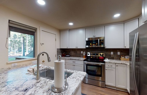 Just steps from The Spa at Sunriver Resort, 32 Tennis Village is the perfect basecamp for exploring Sunriver and beyond. This 1,580 sq. ft. home is enjoyable for up to 6 guests with its 2 bedrooms and 2 bathrooms. Inside this lodge-style condo you will find spacious kitchen, living, and dining areas with vaulted ceilings, wood paneling, and beam accents.