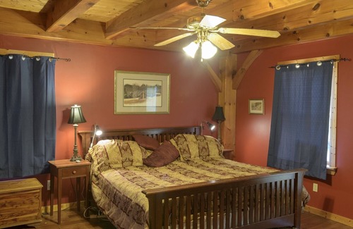 This property is unique in that it is remote yet near so many places. The master bedroom is downstairs with a private bath, private sitting area with television, king size sleep number bed, and a private deck with a large outdoor hot tub. Four bedrooms are upstairs connected by a common den with huge vaulted ceiling and each bedroom has its own private vaulted ceiling. ( those cuelga are a recent upgrade) Each of those bedrooms has a very comfortable (1) king, (2)queens or (1)double bed. There is a 46 foot screened porch on the front with plenty of sitting room including rocking chairs and a porch swing! There is a large deck off the back dining room as well with a table, chairs and a gas grill. Everything you need to make a perfect getaway in Central KY. The open space and extra-wide interior doors make it easy for wheelchairs. We also have a portable ramp to use for the 2 steps up through the garage into the house if needed. The entire house is very open with extra tall and vaulted ceilings and lots of exposed wood. Spacious kitchen with all amenities you would want. As we are near Shaker Village we have decorated the house with Shaker-style furniture and primitive American decor. This is the perfect place to gather with family or friends and enjoy nature while being close to so much!! The fire pit outside is a guest favorite! After a waiver is signed we can arrange for use of the hot tub and for hiking. We can recommend a great place to fish as well! (our pond unfortunately has NO fish!) You are also invited to stroll up and down the scenic half mile paved driveway.