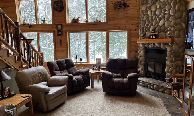 Perfect ATV/Snowmobile getaway. Don’t forget the boat, the landing is right down the street for multiple lakes. Located on a dead end road, but close to bars, restaurants, and convenience stores/gas stations. Can accommodate your whole family and then some. On summer nights, fire up the grill and sit around the campfire on our private wooded 5 acres. On those cold winter nights, stoke the massive stone fireplace and warm up while watching a movie.
