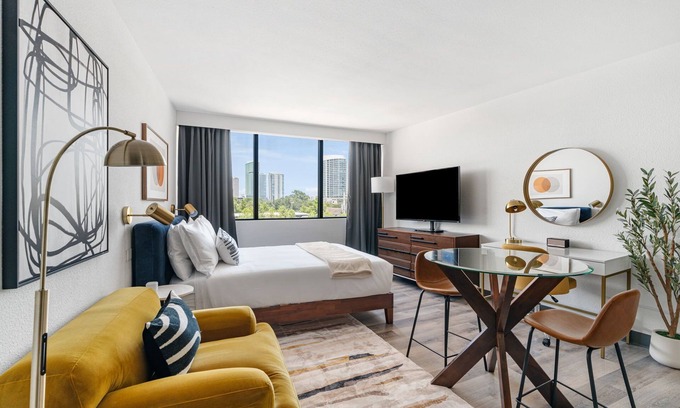 Stylish, comfortable, and thoughtfully furnished studio (367 SF, 4th floor) at Lodgeur Upper Kirby. Enjoy a chef-ready kitchen, fast WiFi, shared laundry just down the hall, and access to a pool and 24/7 gym. Designed for both short and extended stays. Steps from Levy Park and local dining. Near Greenway Plaza, the Galleria, Montrose, Rice, the Texas Medical Center, Midtown, and Downtown Houston.