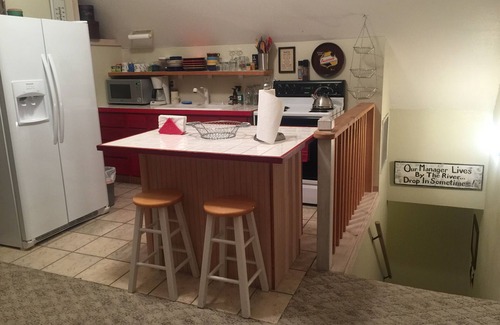 The apartment above the garage is available for people that need a cozy and quiet place to sleep and unwind. This private space offers basic amenities gorgeous property for a fraction of the cost. Great for fishing tournaments, temporary work assignments or visiting friends at the lake. The Hideaway is a 1 room apartment above a garage, with a king bed, queen bed, alongside a mini kitchen, and full bath. The kitchen has a full refrigerator, microwave oven, full-size stove, and oven and is fully equipped. Outdoor amenities are not included for the entire stay.