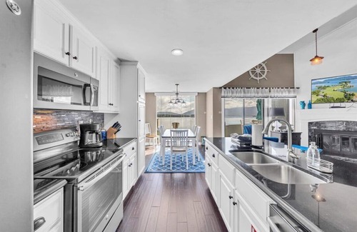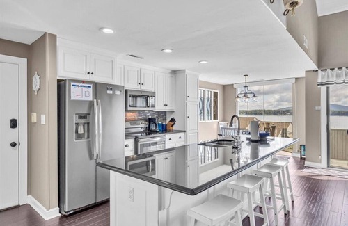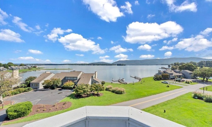 STUNNING Top Floor Unit that sleeps 8. "All Decked Out" is a luxurious two-story condo situated in the picturesque Bernard's Landing at Smith Mountain Lake, VA. This stunning property offers breathtaking panoramic views of the water and sunrise. The main level features a King Suite with an en-suite bathroom, a second bedroom with twin beds, a shared full bath, a fully-equipped kitchen, dining area, and a living room with a flat-screen TV. Step outside onto the main level deck, furnished with table and chairs. The loft includes an additional King bed, a Twin bed with a trundle, an entertainment center, and access to a spacious upper level deck to take in the view.