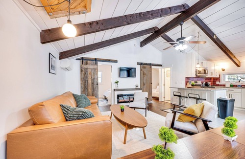 DETACHED LOFT SUITE: Dreamy loft sleeping area, living area w/ electric heating stove, large flat-screen TV, full bathroom w/ tub