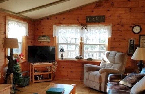 The cabin boasts an open floor plan consisting of a living room, kitchen, dining area and bathroom on the upper level. The lower level has two bedrooms. The first has a queen bed and a set of twin bunk beds; the second has a queen bed. The front porch has comfortable furniture so you can watch the kids roast their marshmallows in the fire pit or just relax with a cool drink. There is a deck off of the living room for you to enjoy a meal or relax and watch the wildlife roam through the woods.