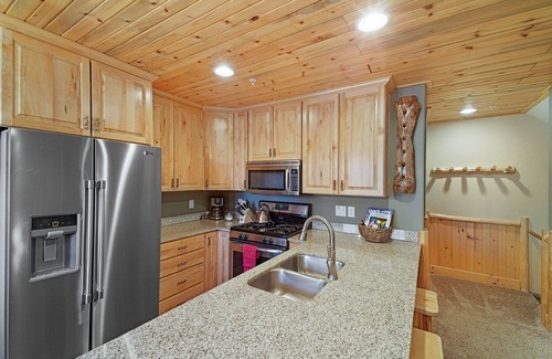 You'll find a gas fireplace downstairs in front of a comfy leather couch that makes into a queen bed. There is a huge 50" SmartTV in the family room, and you can use it to access Pandora, Netflix, Vudu, Facebook, YouTube and a bunch of other apps. There is also a full kitchen with stainless steel appliances and granite countertops.