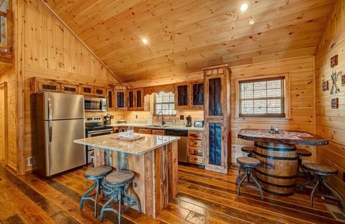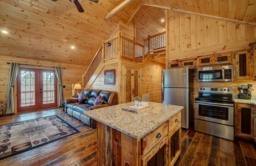 Porch & Deck – You’ll delight in the mountain views from the lighted, covered full-length porch with ceiling fans. Relax in the hot tub and feel your cares melt away. The porch's gas grill lets you feast your eyes on mountain scenery while grilling a feast for your loved ones. The lower level, lighted deck makes a great place to gather with loved ones around the metal fire pit. For security purposes, the cabin has external cameras monitoring the exterior front entry and driveway. These devices may be operational during your stay.