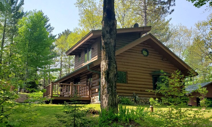 True log cabin in the Northwoods of WI sleeps 8 and is open year round. This cabin is full of amenities w/ seasonal activities all around and is surrounded by multiple lakes. It's located on the snowmobile trail for winter fun and ATV/UTV trail for summer/fall fun. 18 hole golf course, public boat launch, public beach, skiing, hiking, and biking trails are all located within 5 miles of this property and is in walking distance of a bar & grill. Garage is stocked w/ a grill & outdoor games.