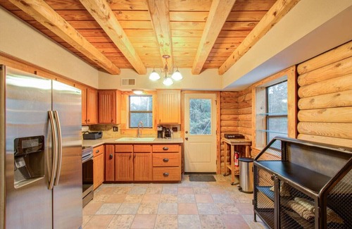 Welcome to your woodland retreat! Our charming 4-bedroom hideaway has two private downstairs bedrooms with queen beds, and a fun open-space loft featuring two twin-over-twin bunk beds. Jump in the pool, grill up some food, or enjoy a cozy evening by the indoor fireplace. Enjoy nights around the fire pit or bounce on the trampoline! Nestled in the trees, yet only minutes from local attractions and adventure, it’s perfect for those seeking both serenity and excitement.