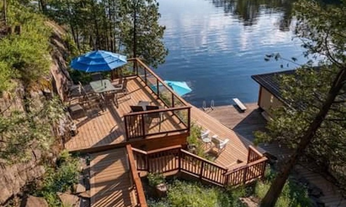Our secluded cottage is extremely private. We are the last cottage on the private road surrounded by forest and a stunning 40 foot waterfall. The cottage is west facing with 2 large docks, boat house, diving board and swim raft. There is a 2 bedroom 1 bathroom guest house which sleeps 6 and a 3 car garage. If privacy is what you want then this is the cottage for you. This cottage has wonderful swimming and gorgeous sunsets.