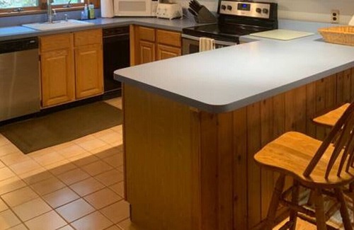 Our cabin has a large open floor plan making it the perfect space for groups to spend time together. You can be cooking in the kitchen on the updated stainless steel appliances while others are watching TV in the living room, playing a game of pool, or enjoying the board games in the loft and all be in one space.