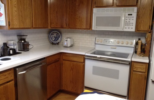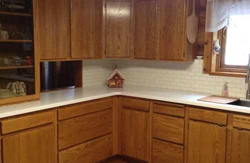 The kitchen is fully equipped for cooking and serving meals. The cupboards are stocked with basic staples such as flour, sugar, spices and coffee.